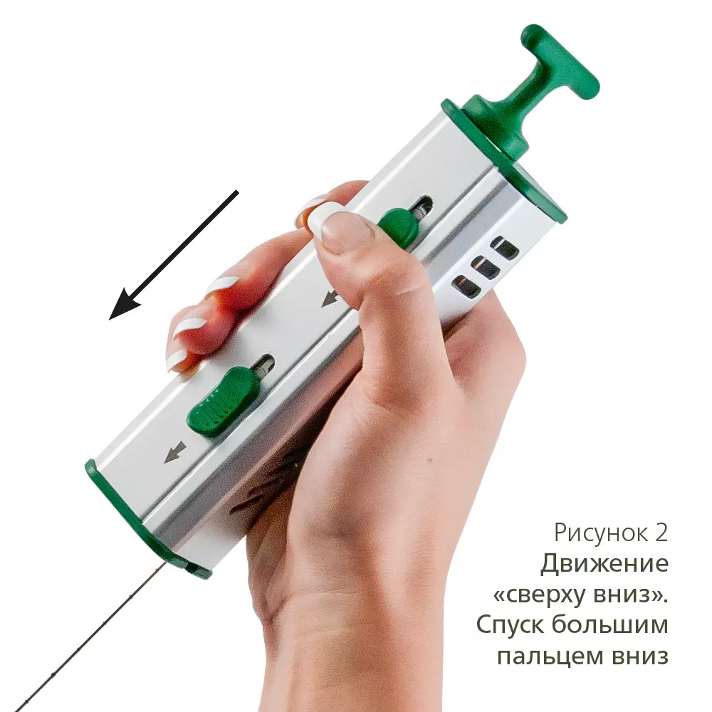 Устройство имеет спусковой механизм, который активируется двумя дублирующими друг друга кнопками. Находясь в разных концах "пистолета", кнопки обеспечивают функциональное применение устройства как маммологом (движение «сверху вниз»), так и урологом (движение «от себя» и «вверх»).