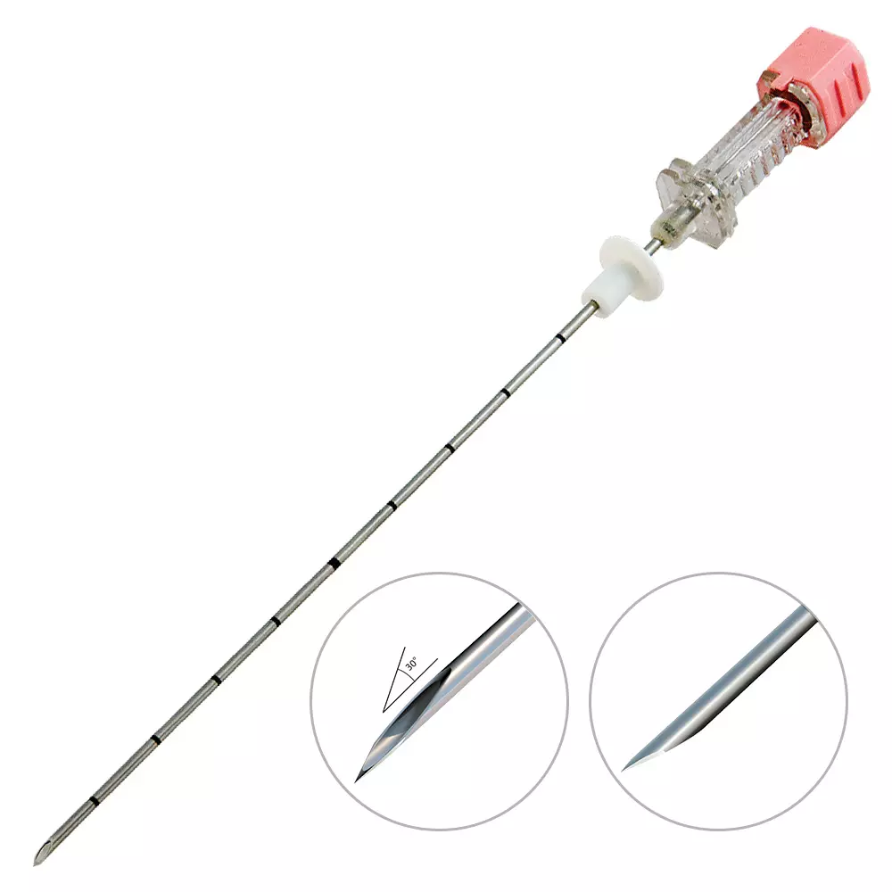 - в отличие от идентичных инструментов, имеющих срез Quinke (режущая кромка обращена к лицевой части среза иглыа), для игл SCBL характерен срез под углом 30⁰, что позволяет легче проникать в ткань