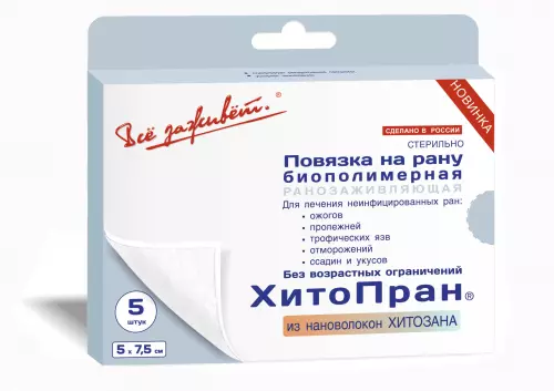 Хитопран – стерильная ранозаживляющая повязка на основе нановолокон хитозана в виде нетканого полотна, стимулирующая и ускоряющая репаративные процессы. Повязку не нужно снимать: Хитопран® резорбируется естественным путем или легко удаляется при промывании раны. Действие повязки основано на биологической активности хитозана и особой структуре повязки. Инновационная технология переработки хитозана, применяемая для создания повязки, позволяет получить структуру с большой удельной поверхностью и пористостью, что обеспечивает благоприятные условия для протекания раневого процесса: под повязкой формируется оптимальная для заживления влажность, обеспечивается воздухопроницаемость и атравматичность. Повязка способствует ускорению эпителизации ран, позволяя существенно сократить сроки лечения и предотвратить образование грубых рубцов. Идеально подходит для лечения ран у пациентов с хрупкой и истонченной кожей.