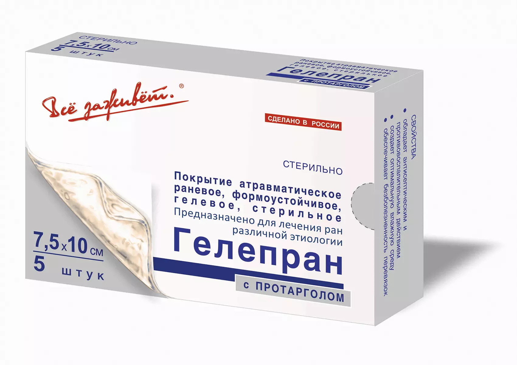 Гелепран - стерильное формоустойчивое гидрогелевое покрытие. Гелепран на 70% состоит из воды и предназначен для ведения ран во влажном состоянии. Мягкая, эластичная структура покрытия позволяет хорошо моделировать повязку на ране, а прозрачность - контролировать рану. Гелепран поддерживает оптимальный для заживления уровень влажности, защищает рану от проникновения микробов извне.