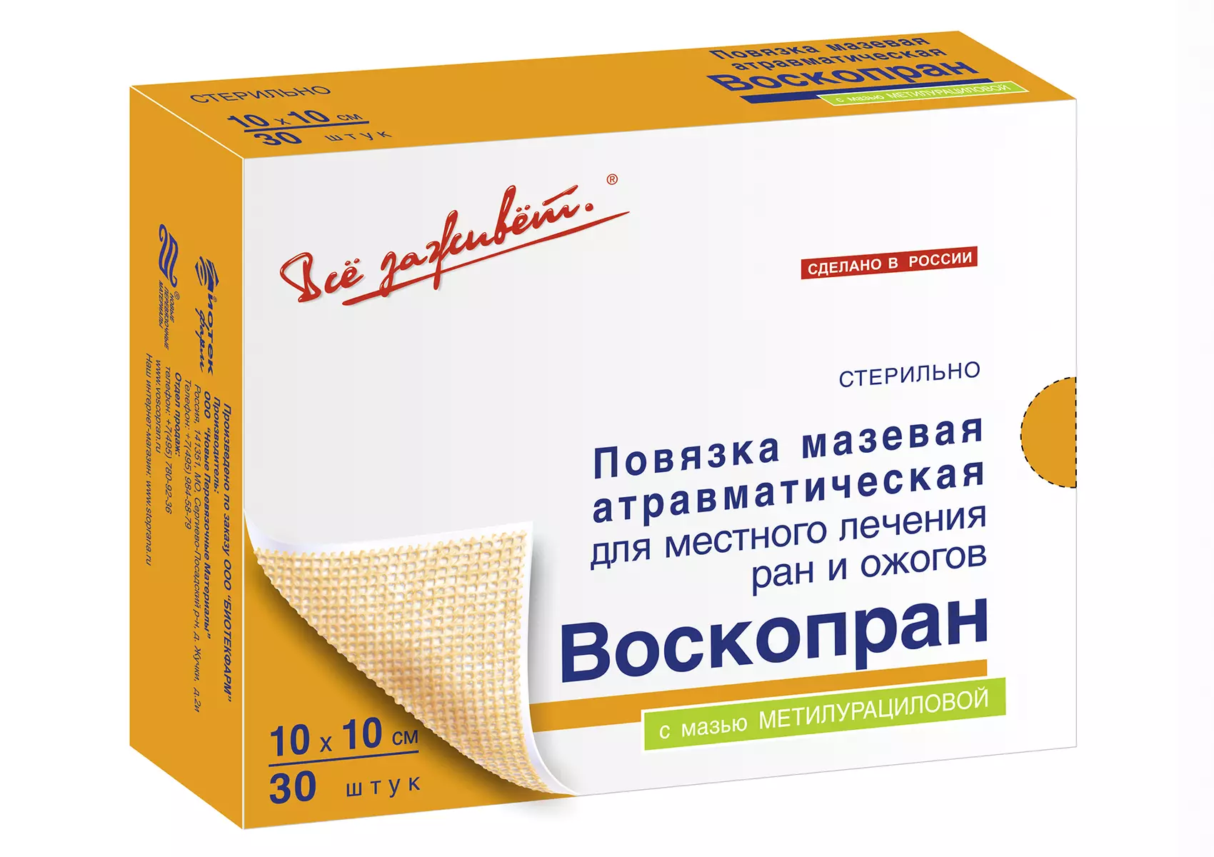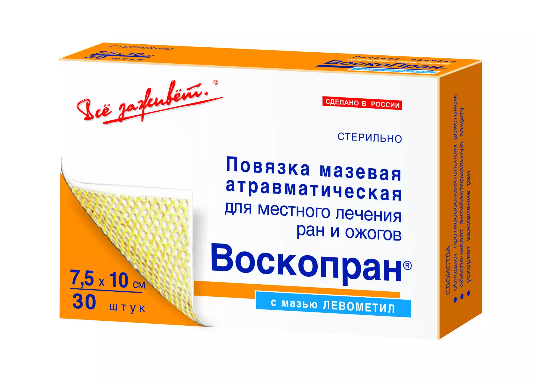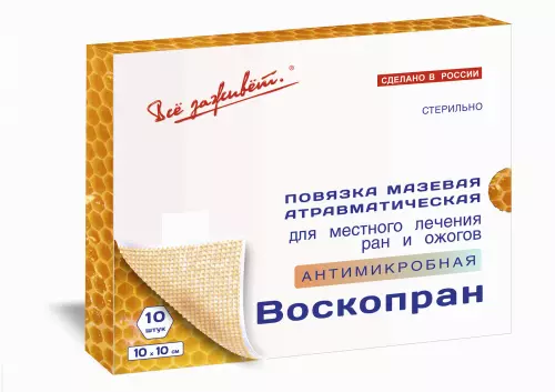 Воскопран – серия стерильных сетчатых повязок, пропитанных воском и лечебными мазями. Основу повязок составляет синтетическая сетка, не оставляющая в ране волокон. Сетка обеспечивает дренажный эффект для раневого экссудата и хороший воздухообмен. Пчелиный воск содержит большое количество аминокислот, минеральных веществ и витаминов. Органика воска воспринимается раной как активная ранозаживляющая среда. Лечебная мазь обеспечивает пролонгированный терапевтический эффект.